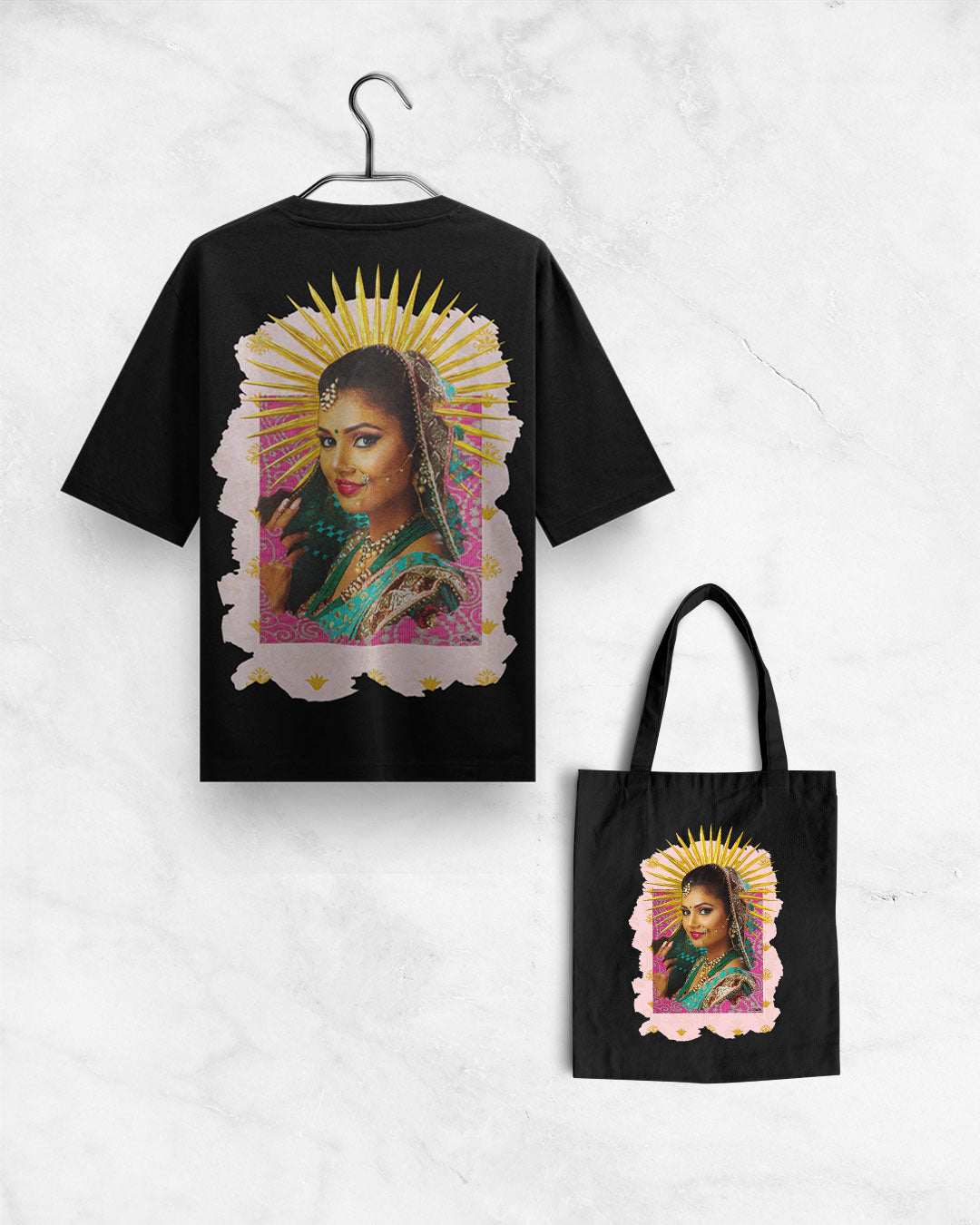 The perfect match: an oversized black T-shirt and a matching statement tote, designed to be worn and carried together. Bold goddess artwork inspired by Indian aesthetics, vintage textures and feminine strength. Part of the Divine East universe - celebrating beauty, culture and women empowerment.