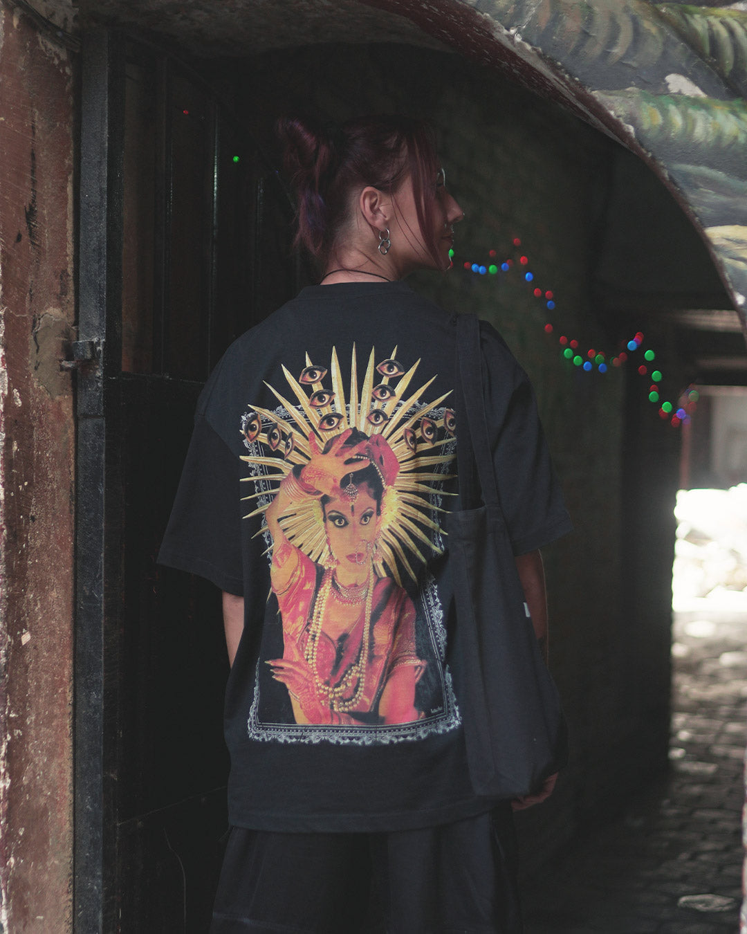 This oversized black T-shirt features a bold goddess collage inspired by Indian aesthetics, vintage textures and feminine strength.