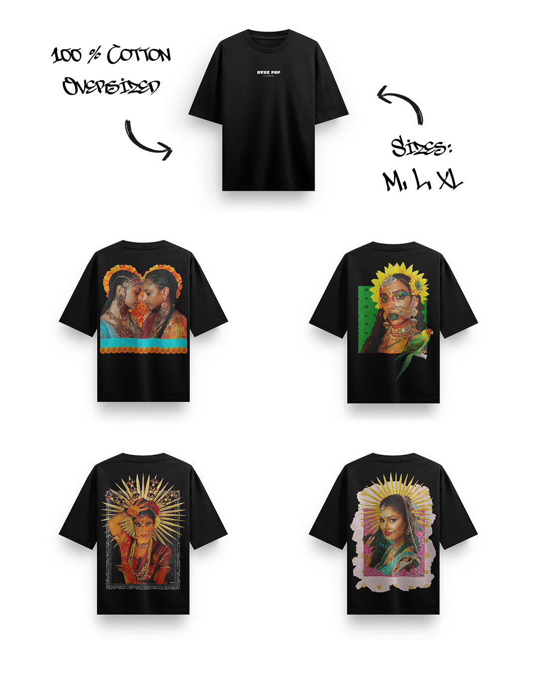 This oversized black T-shirt features a bold goddess collage inspired by Indian aesthetics, vintage textures and feminine strength.
