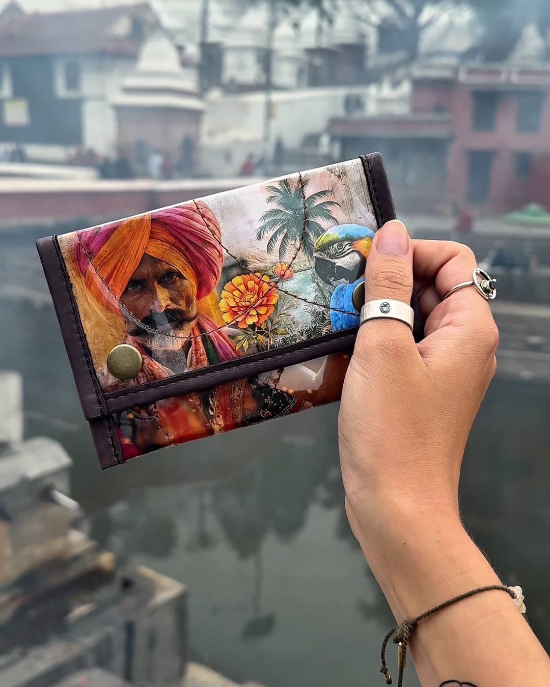 The collages are created from hand-painted artworks as well as scanned found objects, motifs and patterns collected in Nepal and India. Leather color stripes, stitching and details vary from piece to piece, making every wallet unique. To ensure durability, each wallet is reinforced with a special protective stitching layer, making it long-lasting and suitable for everyday use.
